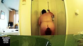 Busty step sister moans as brother and best friend spoon her huge fake tits pussy in shower hostel fuck.