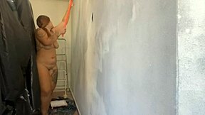 I shower at swinger hotel while hubby films a special message for you.