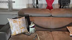 Eighteen-year-old tattooed teen in first casting spreads pussy on sofa