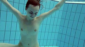 I flash my bright tits underwater in the pool, making everyone horny