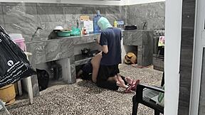 stepsister stuck in kitchen bares her tempting brown buttocks on film