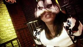 i find a brunette in cosplay stockings and heels with a kitty mask 19:37
