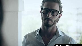 Stunning hungarian redhead with fake tits fucks bank clerk at office to settle debt, getting hard bargain.
