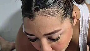 asian babe in lingerie teases boss's cock with her big tits
